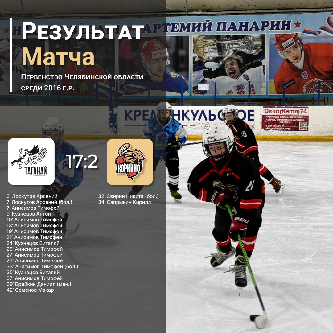 "Корино 2016" в Златоусте терпят крупное поражение от команды "Таганай 2016" со счетом 17:2.Свирин Никита и Сапрыкин Кирилл смогли отличиться заброшенными шайбами.